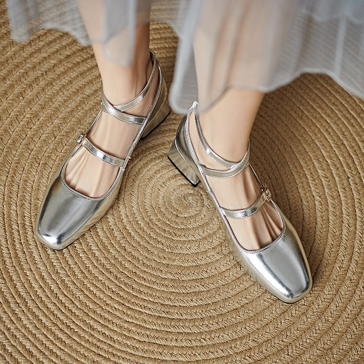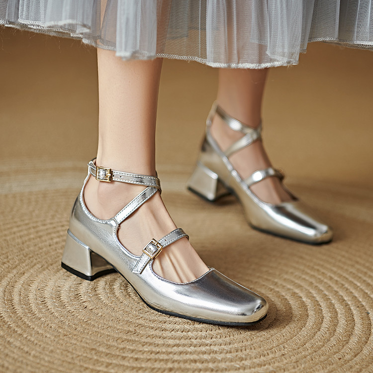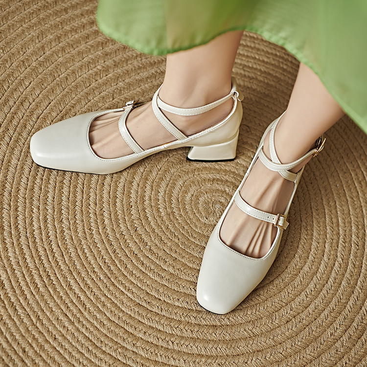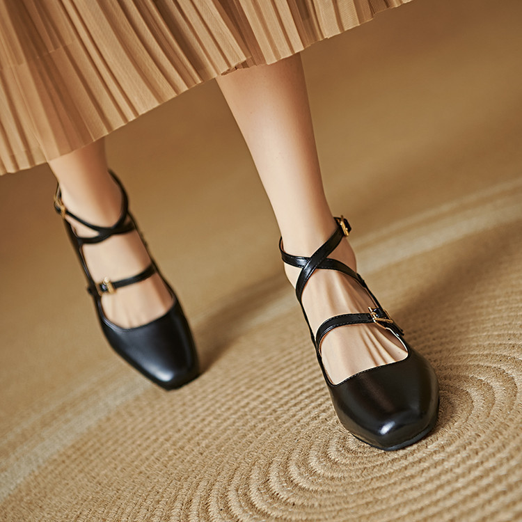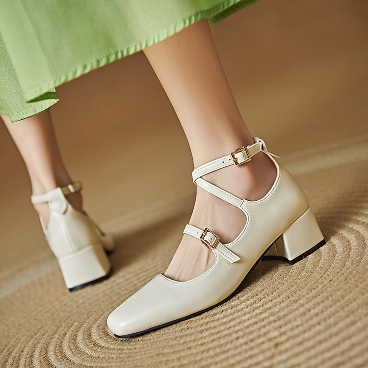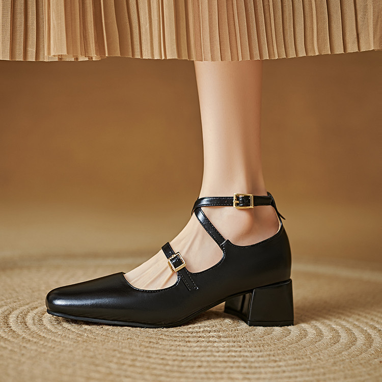 British-style Square-toe Mid-heel Buckle-toe Women's Pumps