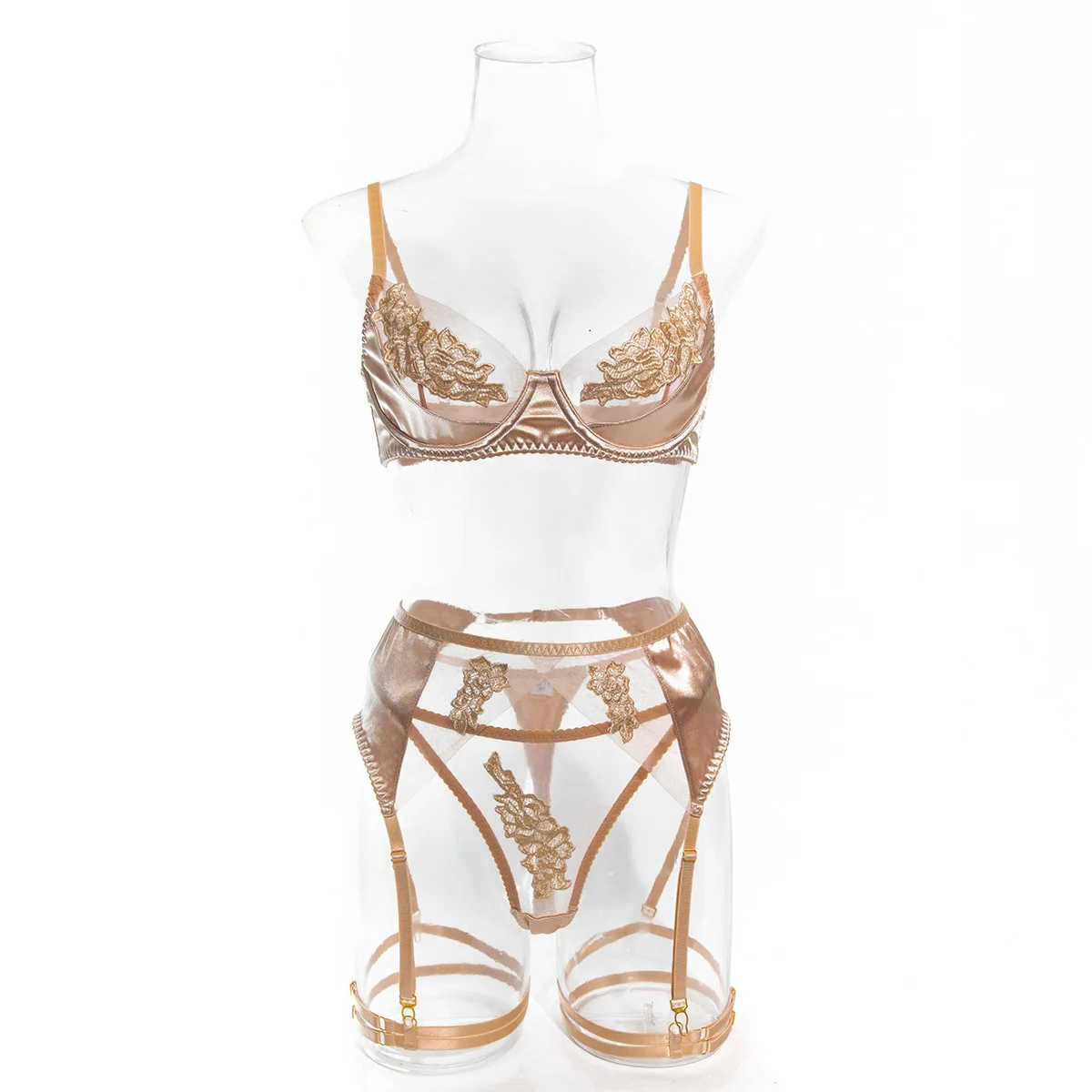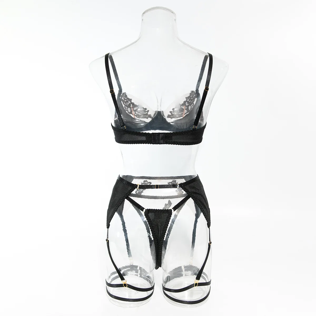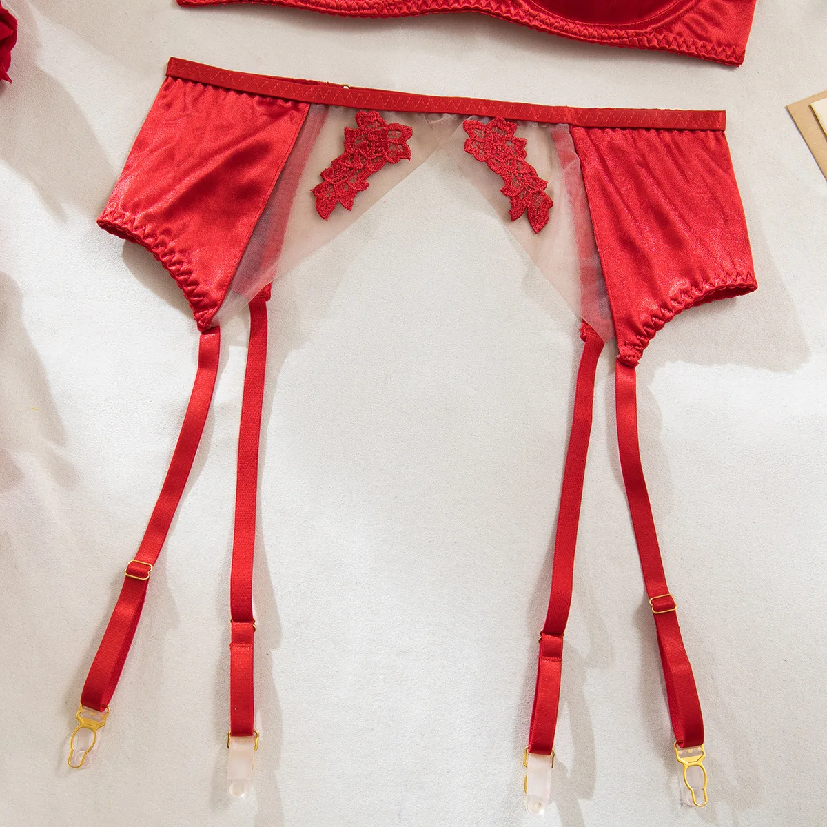 French Style Sexy Three-Point See-Through Lingerie Mesh Embroidery Patchwork Push-Up Bra Thong Four-Piece Set