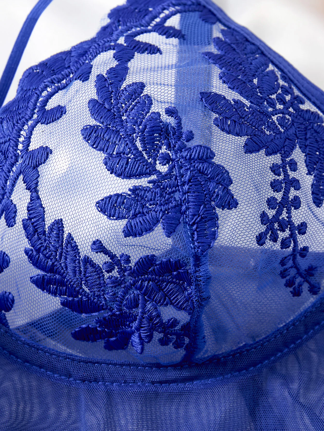 Ladies' blue countryside style wheat ear embroidery semi transparent nightgown, elegant and comfortable, bow design ZA825066