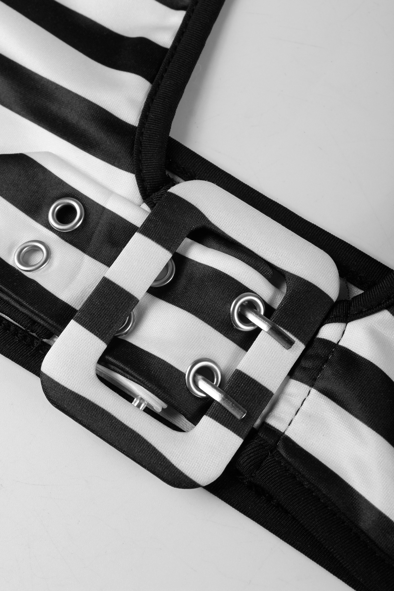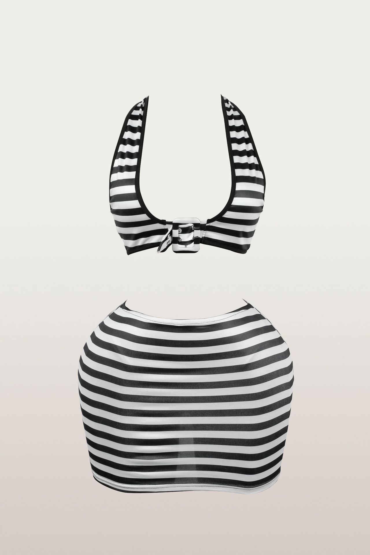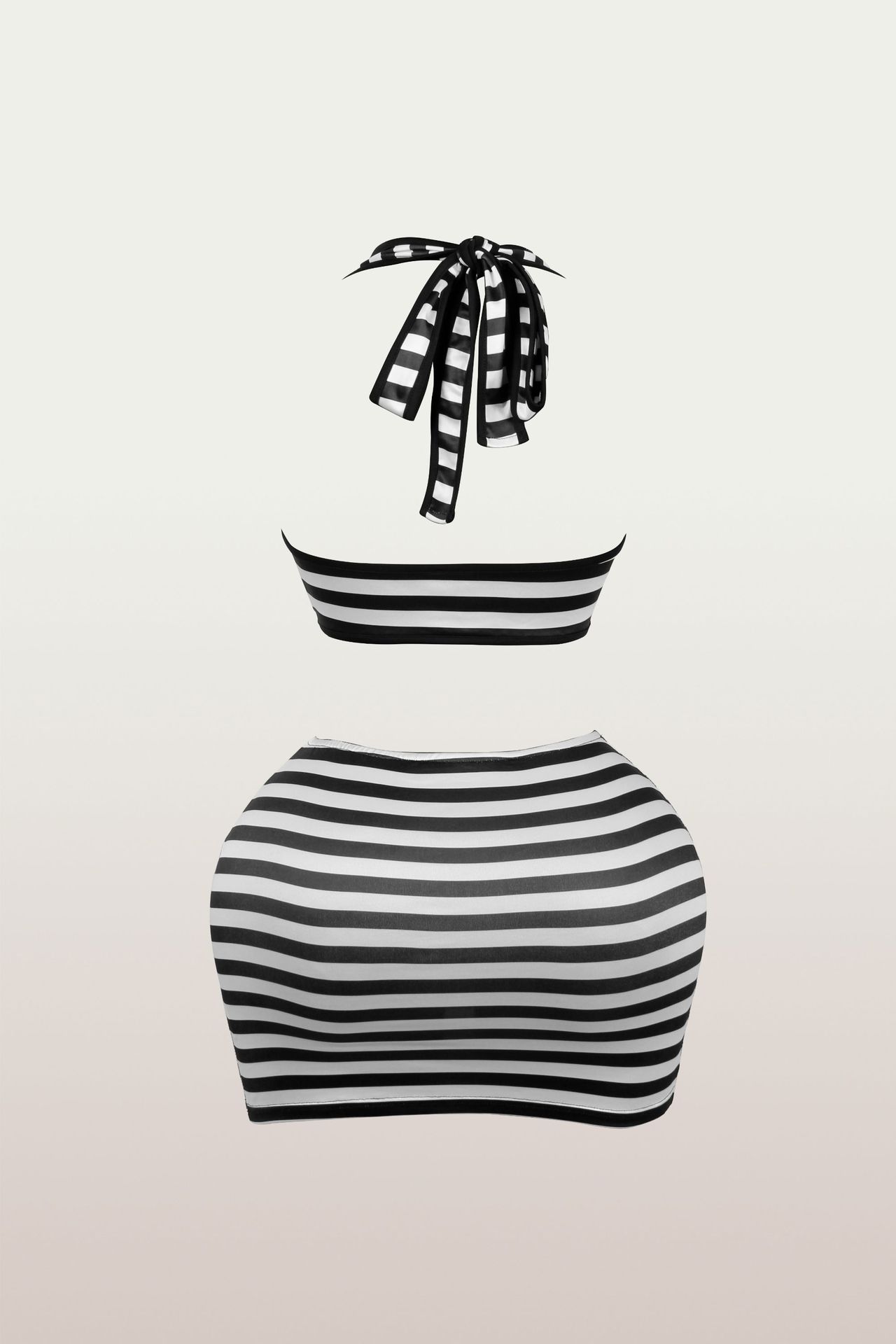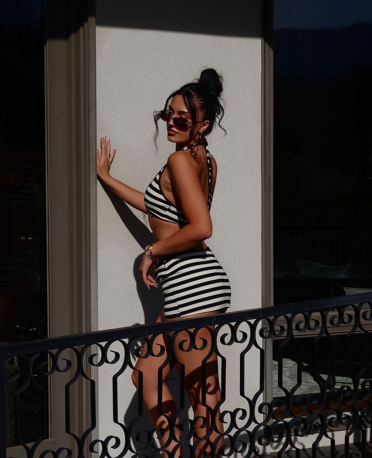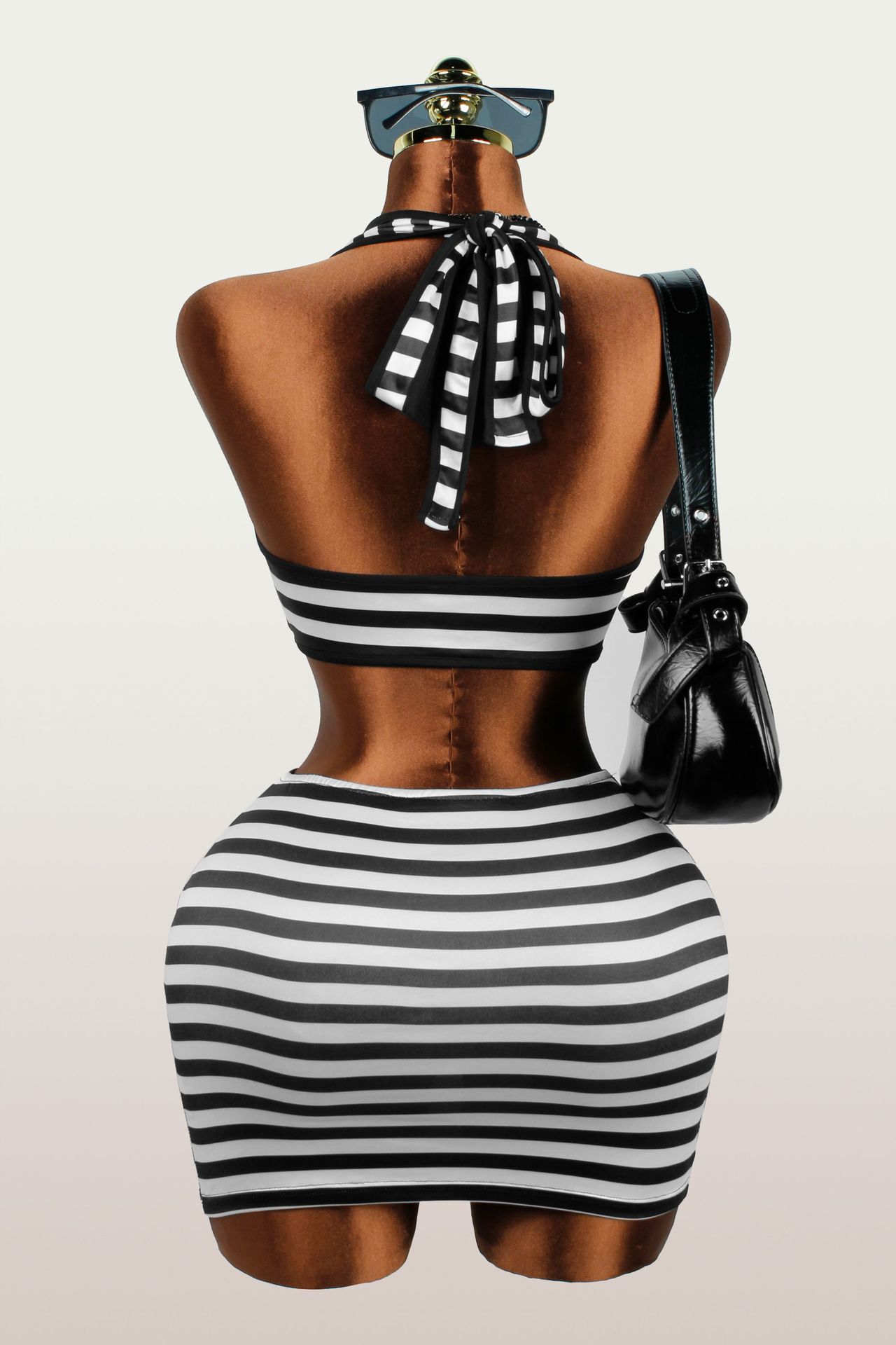 Fashionable Black-and-White Striped Printed Halterneck Sleeveless Midriff-Baring Tank Top And Sheath Mini Skirt Set