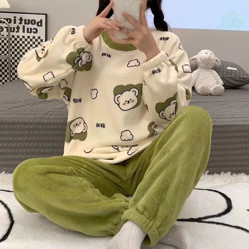 Large Size Pajama Woman Winter Coral Velvet Student Homewear Two-Piece Wearable Round Neck Long Sleeve Long Trousers Flannel Paj